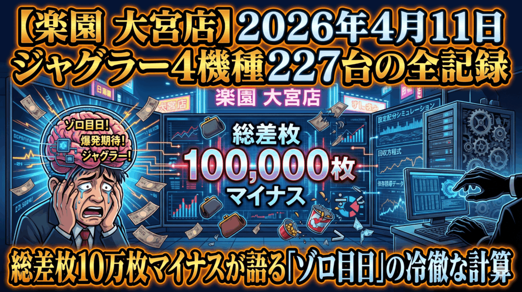 【楽園 大宮店】2026年4月11日、ジャグラー4機種、227台の全記録。総差枚10万枚マイナスが語る「ゾロ目日」の冷徹な計算