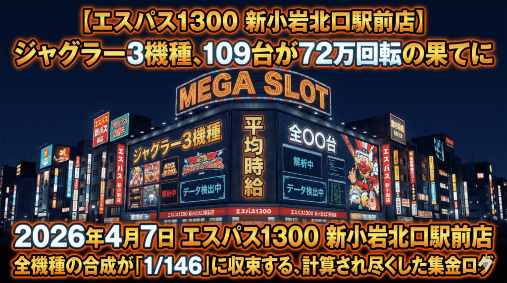 【エスパス1300 新小岩北口駅前店】2026年4月7日、ジャグラー3機種、109台が72万回転の果てに。全機種の合成が「1/146」に収束する、計算され尽くした集金ログ