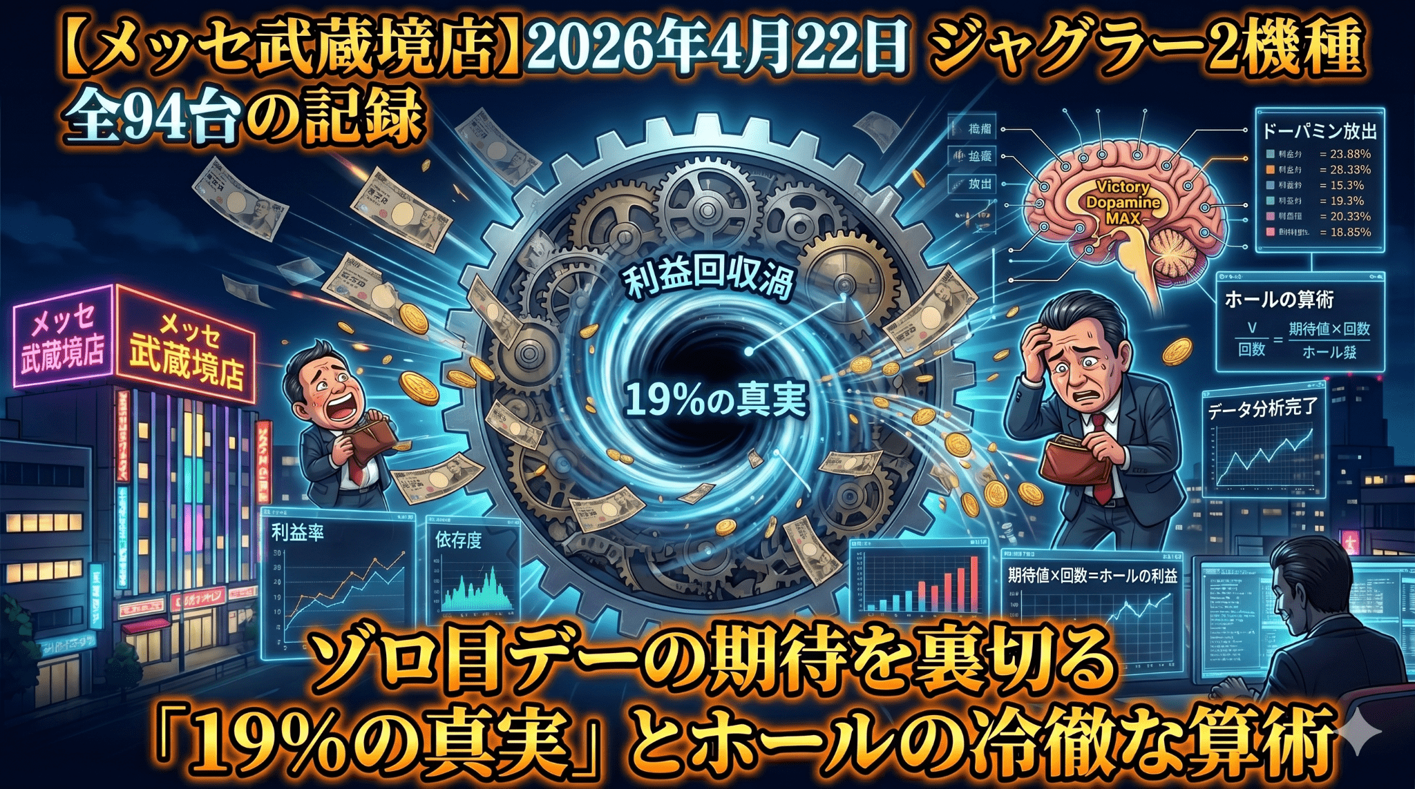 44台で勝率36.4%。16台 の勝者こそ出ましたが、全体差枚数は5,000枚以上の赤字。アイム特有の「現状維持」に見せかけた低設定配分が機能しており、期待値プラス(労働報酬超え)を達成したのはわずか8台(18.2%)です。5人に1人しか、武蔵境の時給水準に届かない。この厳しい現実に直面しながら、打ち続けるべき根拠はどこにあったのか。