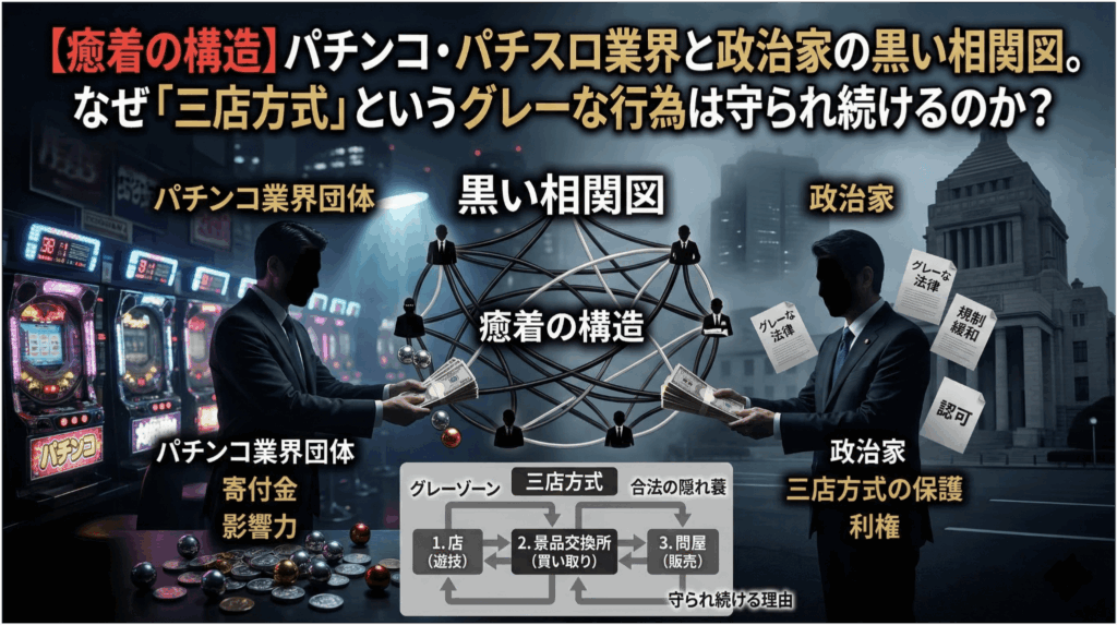 【癒着の構造】パチンコ・パチスロ業界と政治家の黒い相関図。なぜ「三店方式」というグレーな行為は守られ続けるのか?