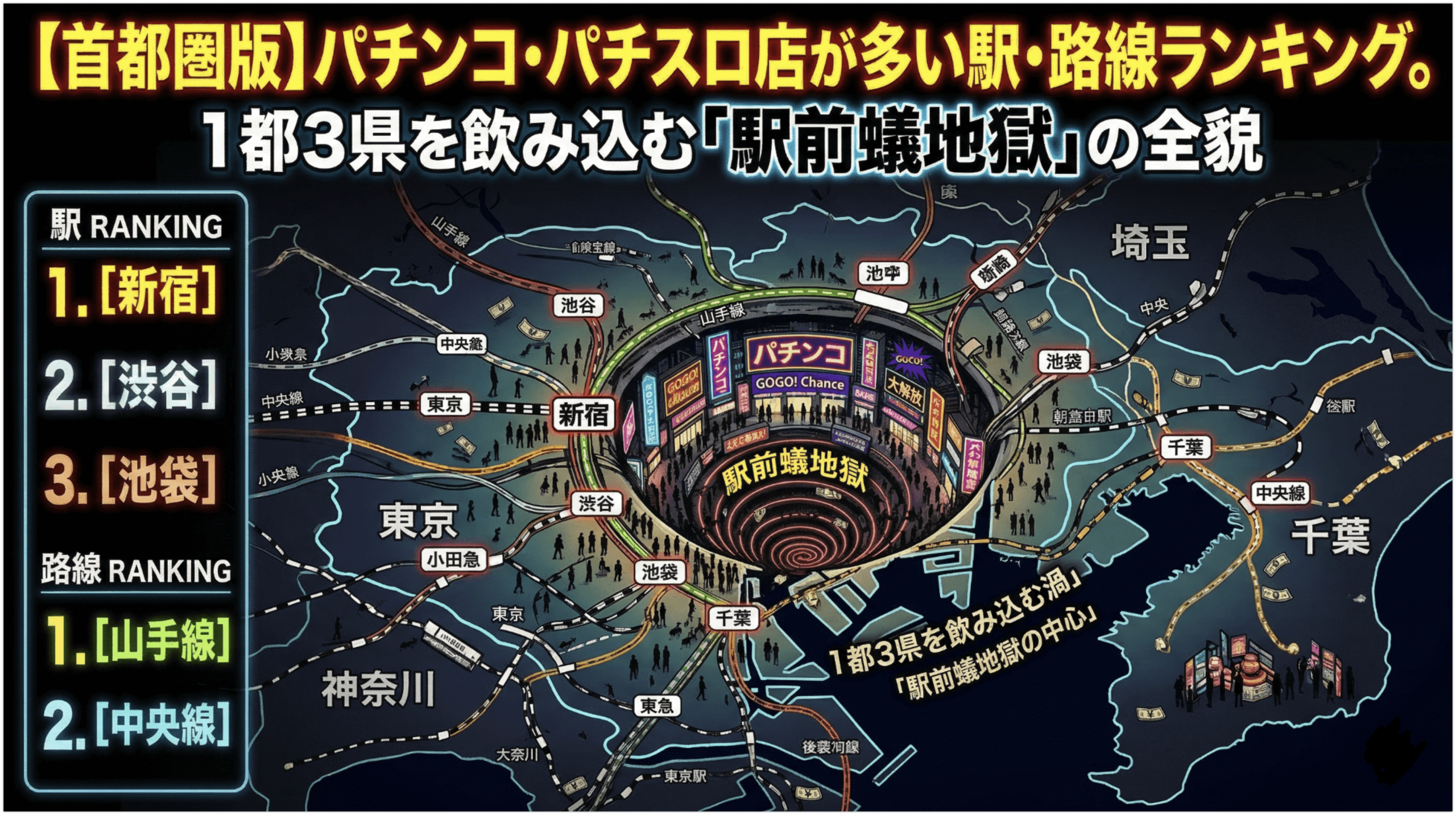 - 池袋駅(東京): 以前も触れた通り、駅徒歩300m圏内の密度は世界屈指。東西の逃げ道を塞ぐように配置された「マルハン」「楽園」「やすだ」の包囲網は、まさに鉄壁です。